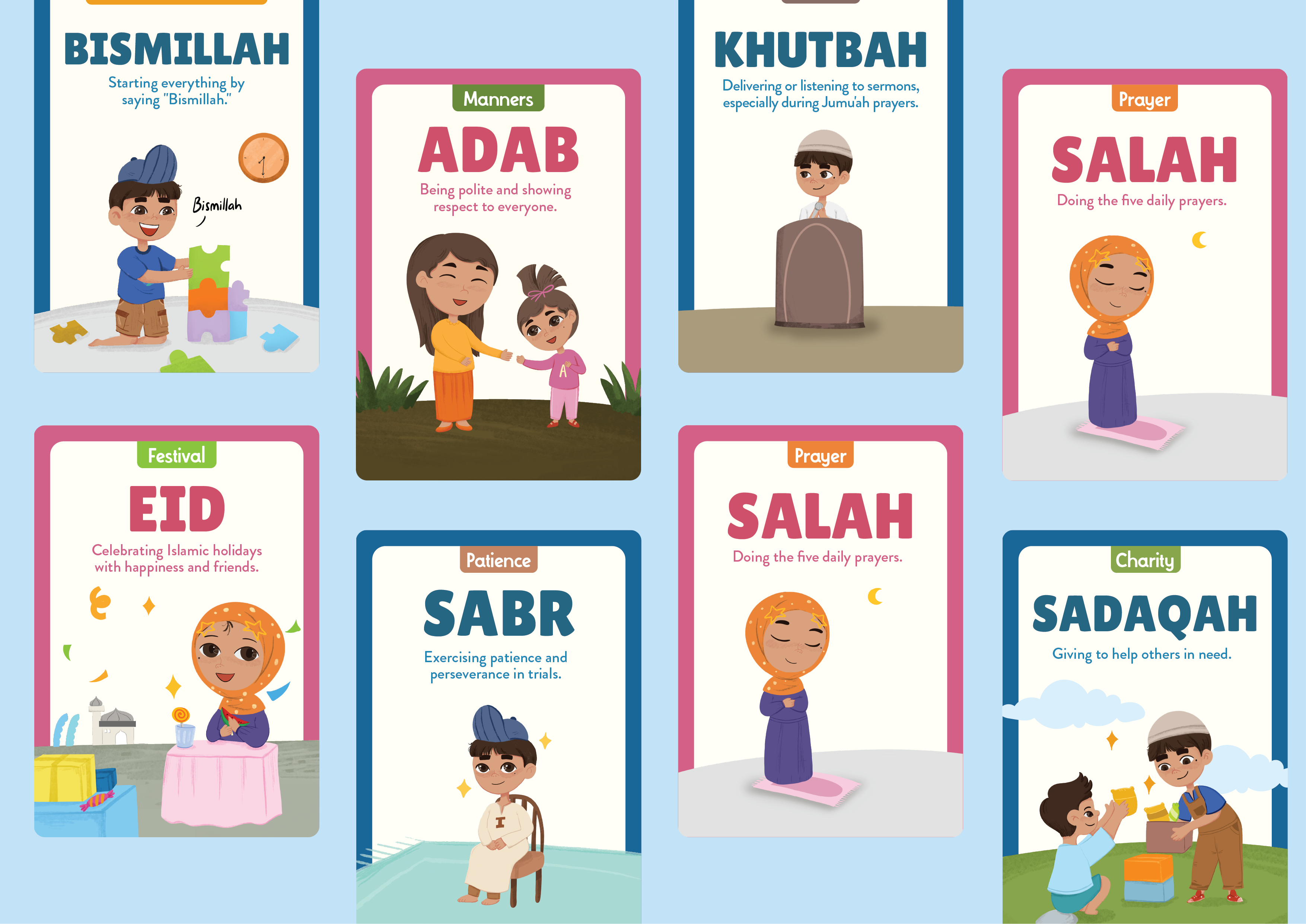 - Islamic Foundation: Each card is inspired by key principles from the Quran and the life of the Prophet Muhammad (peace be upon him), helping your child grow with strong moral values.